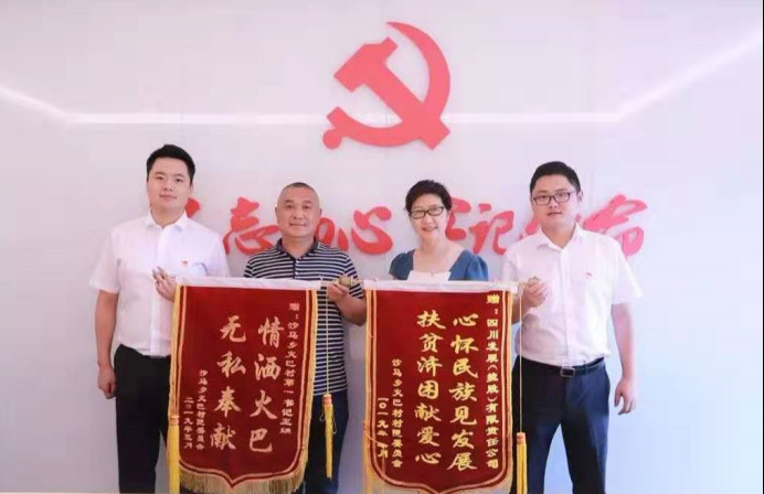 2019年7月9日,四川发展派驻白玉县火巴村第一书记王燚驻村期满回司述职,并带来白玉县火巴村全体村民送来的锦旗—“心怀民族见发展,扶贫济困献爱心”,表达对四川发展公司定点扶贫期间所做工作的感谢。